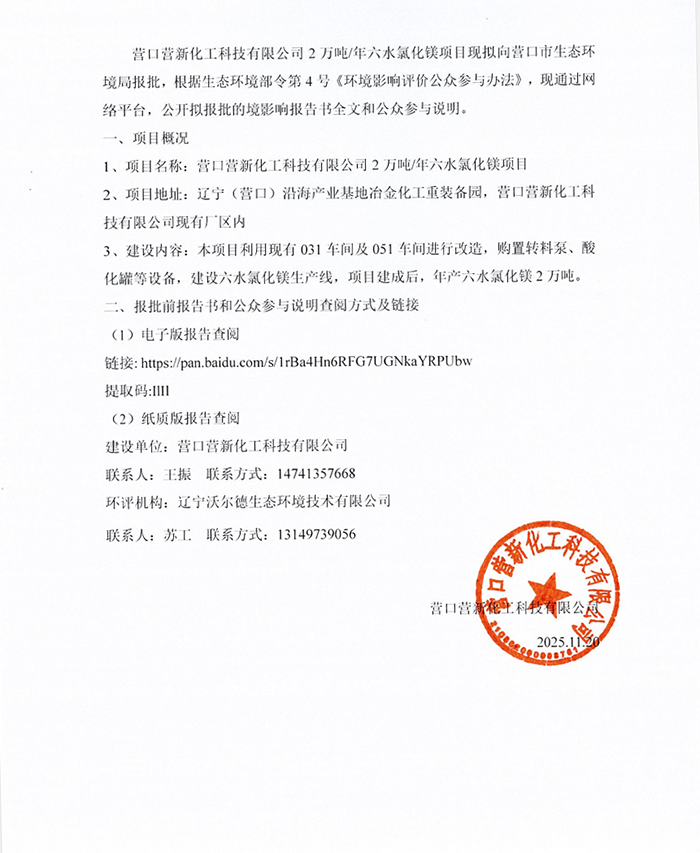 营口营新化工科技有限公司2万吨/年六水氯化镁项目环境影响评价公示(报批前公示)